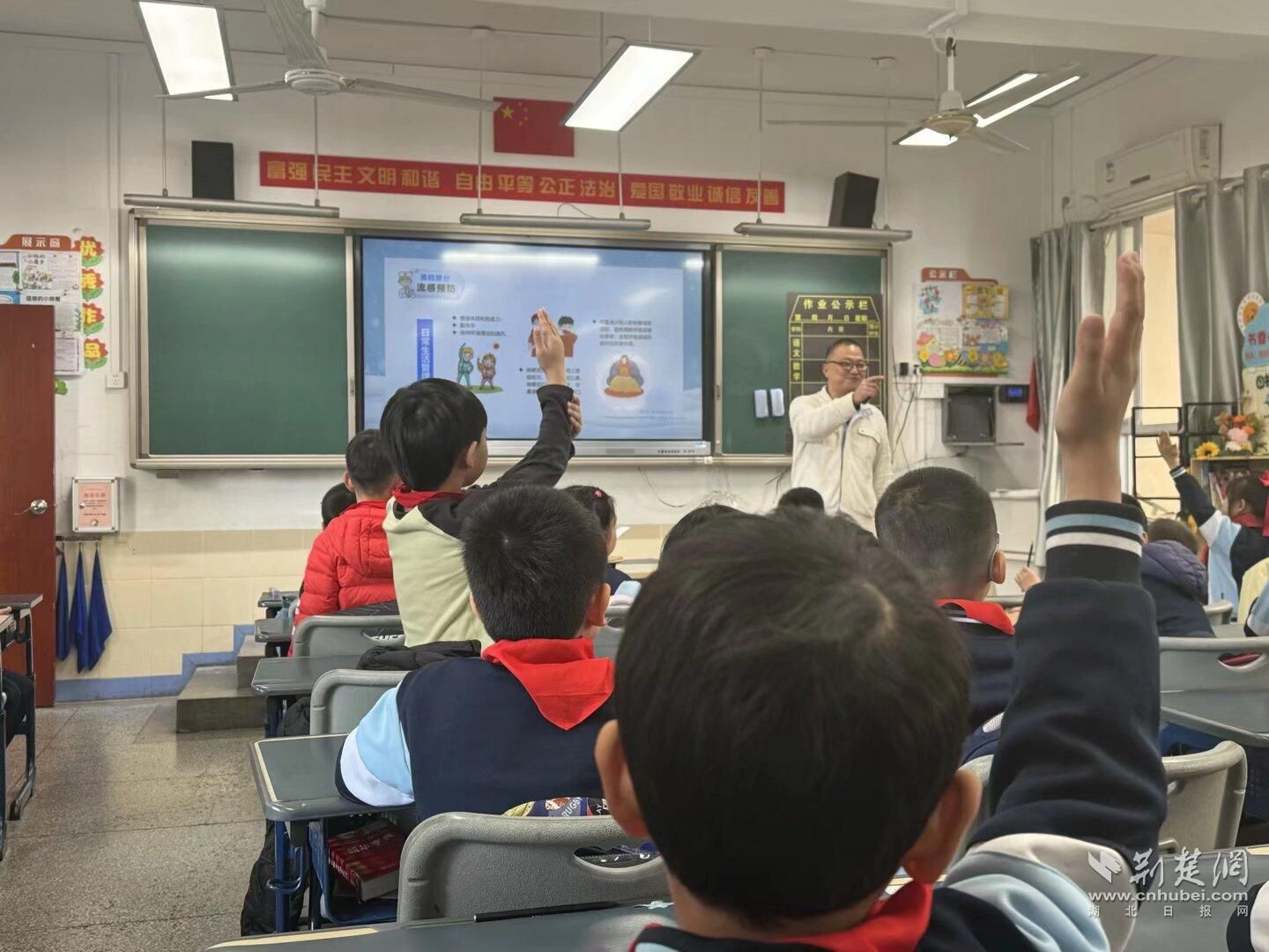 荆楚网(湖北日报)讯(林山记者)11月24日下午,华中科技大学同济医学院附属协和医院感染科赵雷教授走进二年级(七年级)教室,为同学们进行了流感预防科普讲座。专业医生、学生家长赵雷老师用临床实例,清晰地讲解了流感的病因、感染途径和典型症状,阐明了流感与普通感冒相比的特殊性和科学的防护方法。